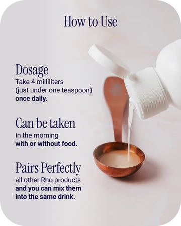 The recommended daily dose can be found on the supplement facts panel on each product. Most Rho products have a serving size of approximately one teaspoon per day. You have the flexibility to take it with or without food, directly from the teaspoon, or mixed into any beverage of your choice. You can combine multiple Rho products into the same drink for added convenience or take them individually.